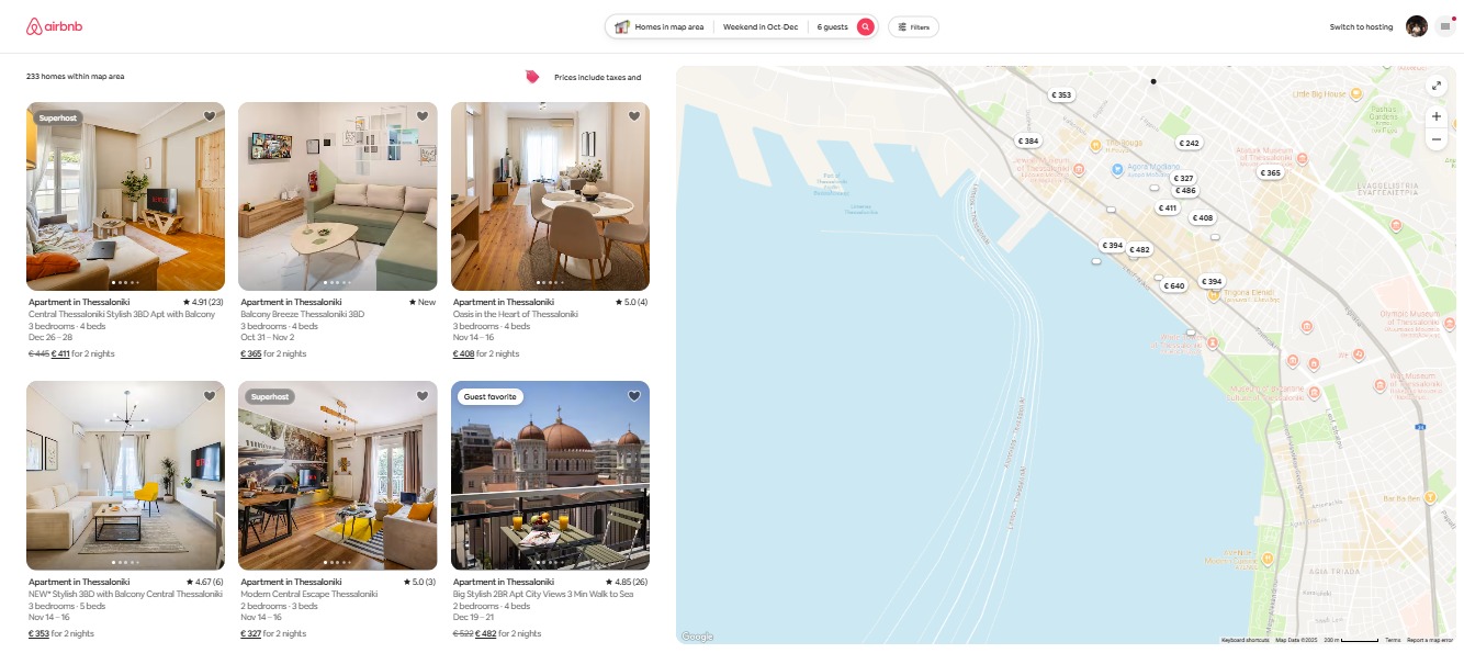 האמת שלא חשבתי שזה יהיה עד כדי כך לפרצוף, פשוט פתחתי חיפוש במרכז סלוניקי (שימו לב שבחרתי 6 אורחים כדי שיפלטר לי רק דירות של לפחות שני חדרי שינה + סלון – באלה מכניסים את התשואה הגבוהה ביותר. תלמדו זאת איתי), וכל 6 הדירות הראשונות הן של לקוחות שלנו: